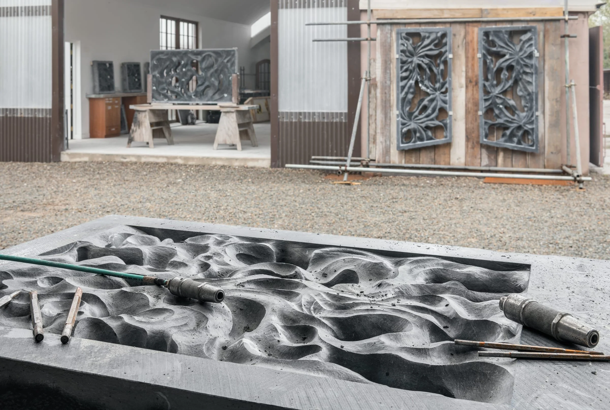 When I push Luke on his process, he says sometimes the work requires some additional carving as hidden elements come to light, which is somewhat of an understatement, as the entire face often requires rebalancing to ensure no single element dominates the composition. Something I have come to realise about Luke’s work is that his process, unlike a painting or a bronze sculpture, is based on the meticulous preparation of the surface itself, rather than an additive process applied to an already perfect surface. The sculptures are not merely objects but experiences, and you have to be in their presence to feel them. The story of their realisation and the months of hard physical labour, heavy lifting and relentless grinding away is missing when you see them float before you: their positioning and interplay with stainless steel plinths create optical tensions, making weighty stone appear to float effortlessly, animating the viewer’s perception of space and form.